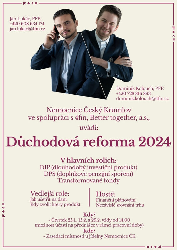 Od 1.1.2024 vstupuje v platnost penzijní reforma a proto jsme pro Vás s vedením nemocnice Český Krumlov připravili sérii přednášek na toto téma, plné praktických tipů, které vám mohou spolu s příspěvky zaměstnavatele přinést desítky tisíc korun.